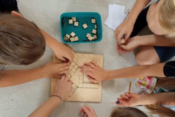 Koncepcja budowy trójkątów i równości pomiędzy ich polami jeszcze była do ogarnięcia ale późniejsze obliczenia z wyciąganiem pierwiastka z pola dużego trójkąta wymagało już dużo wsparcia (pomimo rozumienia pierwiastków). To jednak podstawa programowa z 8 klasy a nasza grupa to głównie klasy 5-6. Ale z lekkim wsparciem policzyliśmy obwody naszych wielokątów z poprzednich ćwiczeń. Tutaj też na razie nie dochodziliśmy do wzoru na twierdzenie Pitagorasa, skupiliśmy się praktyce. Moim zdaniem nauka na pamięć wzorów (czy tabliczki mnożenia) nie ma sensu dopóki się ich dogłębnie nie doświadczy i nie zrozumie. A wtedy często już nie trzeba się ich uczyć.