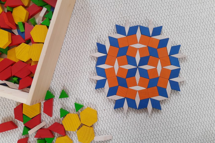 Mozaika to jedna z moich ulubionych zabawek-pomocy do matematyki, z pomocą której już przedszkolak może eksplorować zależności geometryczne. Ogromnie wszechstronna a jednocześnie prosta. Jej uniwersalne kolory pobudzają wyobraźnię i zachęcają do tworzenia. Mozaika, znana za oceanem jako „pattern blocks”, jest powszechnie używana do nauki liczenia, ćwiczenia rytmów, symetrii, ułamków. W Internecie wpisując „pattern blocks” można znaleźć mnóstwo gotowych kart pracy na każdym poziomie nauczania.