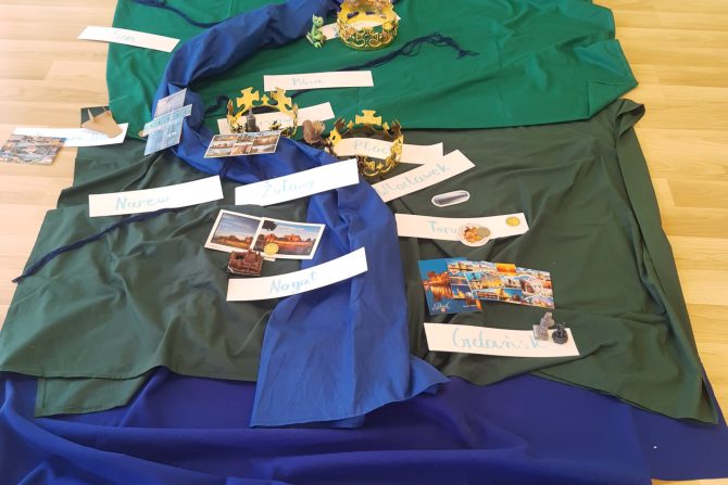 Dziś przychodzę do Was z opowieścią dla dzieci w każdym wieku. Ilość szczegółów możecie dopasować do Waszego dziecka / grupy. Ze starszymi dziećmi dobrym pomysłem jest przekazanie im opowieści i poproszenie ich o stworzenie scenografii, dając im dostęp do różnych materiałów. My tak właśnie działałyśmy – ja stworzyłam opowieść a Dwunastolatka stworzyła do niej tło materialne, które zaprezentowała przed naszą grupą dzieci w ED. W jej zasobach znalazły się pocztówki z naszych zbiorów lub zamówione na specjalną prośbę, monety pamiątkowe, figurki i zdjęcia znalezione w Internecie. Do tego materiały znalezione w domu – filc, włóczki do stworzenia rzek lub duże płachty materiału, których używam do wielkich lekcji czy innych opowieści. Można też dzieciom dać koszyk z zebranymi materiałami i mapę aby mogły je dopasować do wymienionych miast i miejsc. Samo ułożenie ich w odpowiedni sposób też będzie dobrym ćwiczeniem znajomości miejsc i umiejętności pracy z mapą.