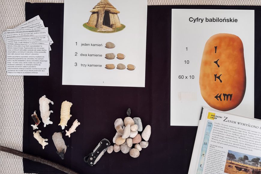 Zaczynamy od historii o dziewczynce lub chłopcu pasącym owce (taką właśnie historię znajdziecie w książce „Wielke odkrycie Bubal”, o której piszę niżej). Opowiadamy o pierwszych pomysłach na przeliczanie – przekładaniu kamyków wypuszczając owce z zagrody, wycinaniu znaków – kresek na patykach. Możemy też wiązać supełki na linie i cokolwiek jeszcze dzieciom wpadnie do głowy. A potem zabieramy je w podróż po cywilizacjach, które wymyślały kolejne systemy liczbowe – od Sumerów, poprzez Egipcjan, Greków i Rzymian oraz Chińczyków. Aż do Hindusów i Arabów, którzy przywieźli liczby które znamy do Europy. Europie chwilę (kilkaset lat!) zajęło przekonanie się do cyfr arabskich i do zera – zdumiewające jest to jak krótko nasze cyfry są w ogólnym obiegu.