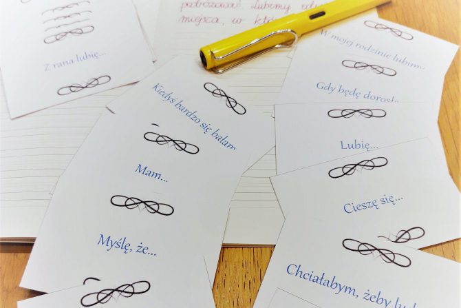 Załączone karty mają na celu spojrzenie wewnątrz siebie. Jest ich 54 więc wystarczą na długo, zakładając, że wybieramy jedną dziennie. Możemy je losować, wybierać tę, na którą mamy ochotę, możemy pisać a dzieci niepiszące mogą rysować. Może to trwać pół godziny a może jedynie 5 minut. Możemy pisać z rana, możemy wieczorem, przed snem. I róbmy to razem z dziećmi, my również na tym skorzystamy! Oczywiście napisane teksty są tajemnicą piszącego, dzieci nie muszą nam ich pokazywać jeśli nie chcą. A jeśli zechcą to proszę, błagam, nigdy nie poprawiajcie błędów! Nie budźmy wewnętrznego krytyka. „Dziękuję, że się tym ze mną podzieliłaś/-eś” zupełnie wystarczy.