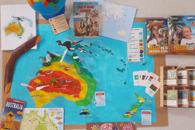 Podczas lektury Tomka, podróżowałyśmy jednocześnie po biomach Australii i Oceanii wg map Waseca (do ściągnięcia tutaj) – to na tej mapie stworzyłyśmy naszą plastelinową makietę. Czytając po kolei o każdym biomie wybierałyśmy charakterystyczne zwierzęta, rośliny lub grupy lokalnej ludności i ustawiałyśmy na makiecie na wykałaczkach. Doczytywałyśmy ciekawostki z różnych książek: serii o Neli Reporterce, Atlasach Cudów czy Rekordów Świata a także z kart i map do odrysowywania z Waseca. Materiały Waseca wciąż chyba nie są dostępne w formie PDF, jedynie do wysyłki z USA (drogo!) ale duża porcja materiałów dodatkowych z ilustracjami do kolorowania i mapami do druku jest dostępna na stronie w sekcji PDF, m.in. w pliku z linku powyżej. A książki oprowadzające po biomach są dostępne na polskim Amazonie, drukowane i wysyłane z Polski. Są napisane bardzo przystępnym angielskim, zawierają sporą dawkę ćwiczeń i zadań, np. dane do tworzenia wykresów opadów, rysowania zwierząt, tworzenia łańcuchów pokarmowych i wzajemnych zależności między fauną i florą. Bardzo je polecam.