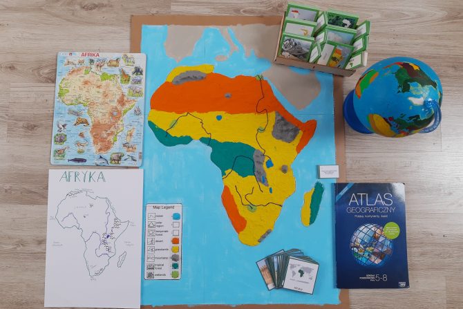 Biomy, czyli inaczej krajobrazy łączą geografię z przyrodą, bo każdy biom a nawet obszary wewnątrz tego samego biomu mają swoją specyficzną roślinność i często również endemiczne zwierzęta. W Afryce żyje mnóstwo zwierząt, których nie spotkamy nigdzie indziej – takich oczywistych jak żyrafy, lwy, nosorożce i gepardy ale i mniej oczywistych jak okapi czy pielęgnice z Wielkich Jezior Afrykańskich. Analizowałyśmy ich adaptacje do warunków w biomie, łańcuchy pokarmowe, sposoby pozyskiwania wody i różne inne „dziwne” zwyczaje (wiecie, że żyrafa śpi tylko 2 godziny na dobę? a żuk z pustyni Namib pobiera wodę z powietrza, skrapla ją i pochylając głowę do przodu, pozwala spłynąć jej z ciała do otworu gębowego?).