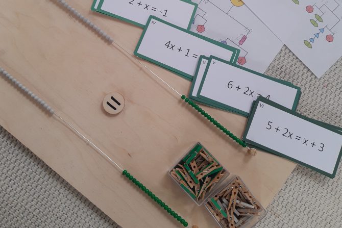 Tutaj pokazuję naszą pomoc do równań (wykonaną przez mojego Męża). Szalki wagi to oba druciki, każdy po jednej stronie znaku równości. Koraliki zielone są dodatnie a szare – ujemne. Zielone klamerki symbolizują x a szare to -x. Planszę układamy poziomo (wygodniej) albo pionowo (wtedy szalki mamy po prawej i lewej stronie, co dla dziecka może być bardziej intuicyjne).